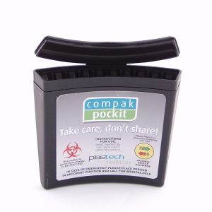 Compact, tough and light, the Pock-It personal sharps bin is easy to carry, safe to use, and is the only product that renders the needle unusable.